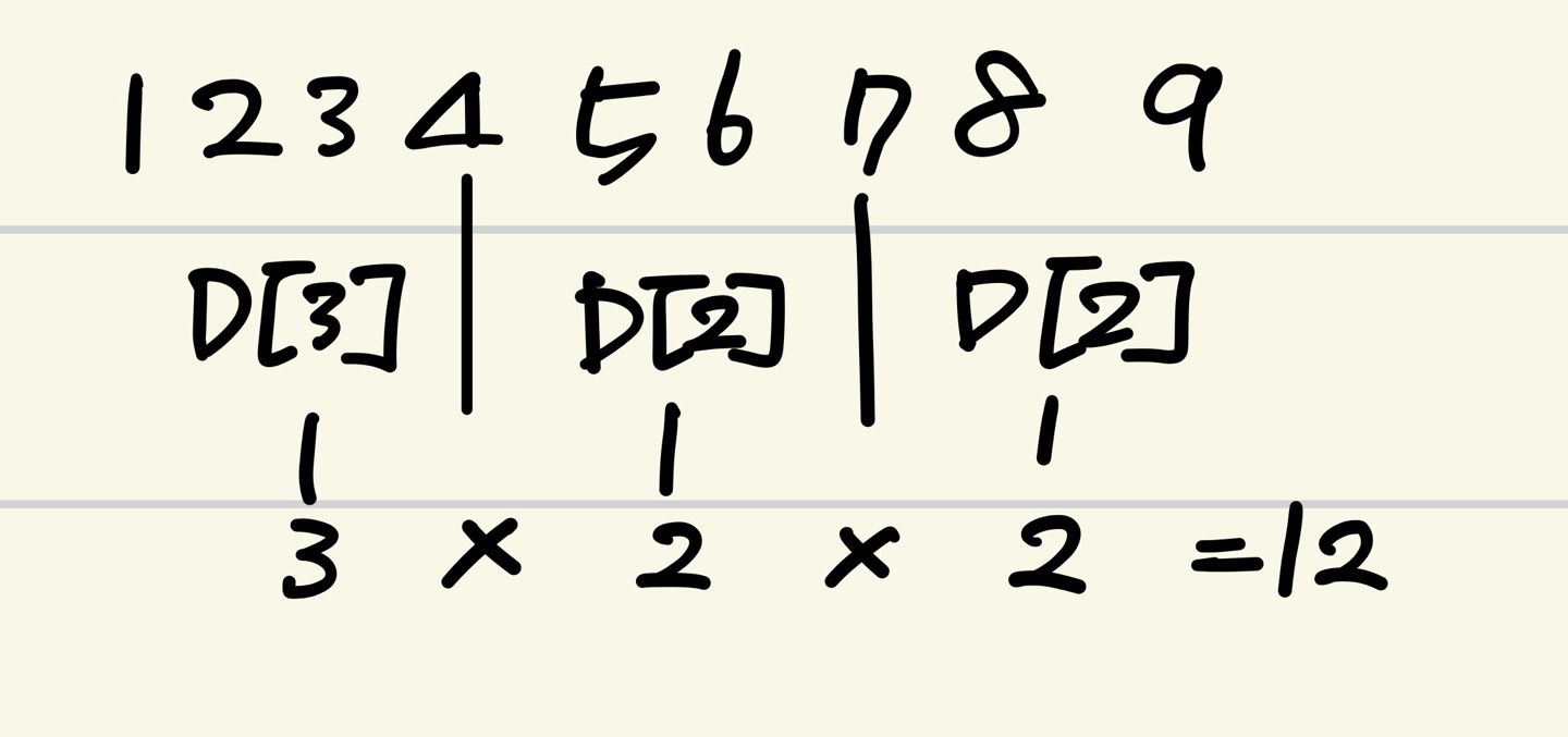 * 정답은 1~3 + 5~6 + 8~9 인데 이는 d[3] * d[2] * d[2] (경우의 수므로 곱셉연산)